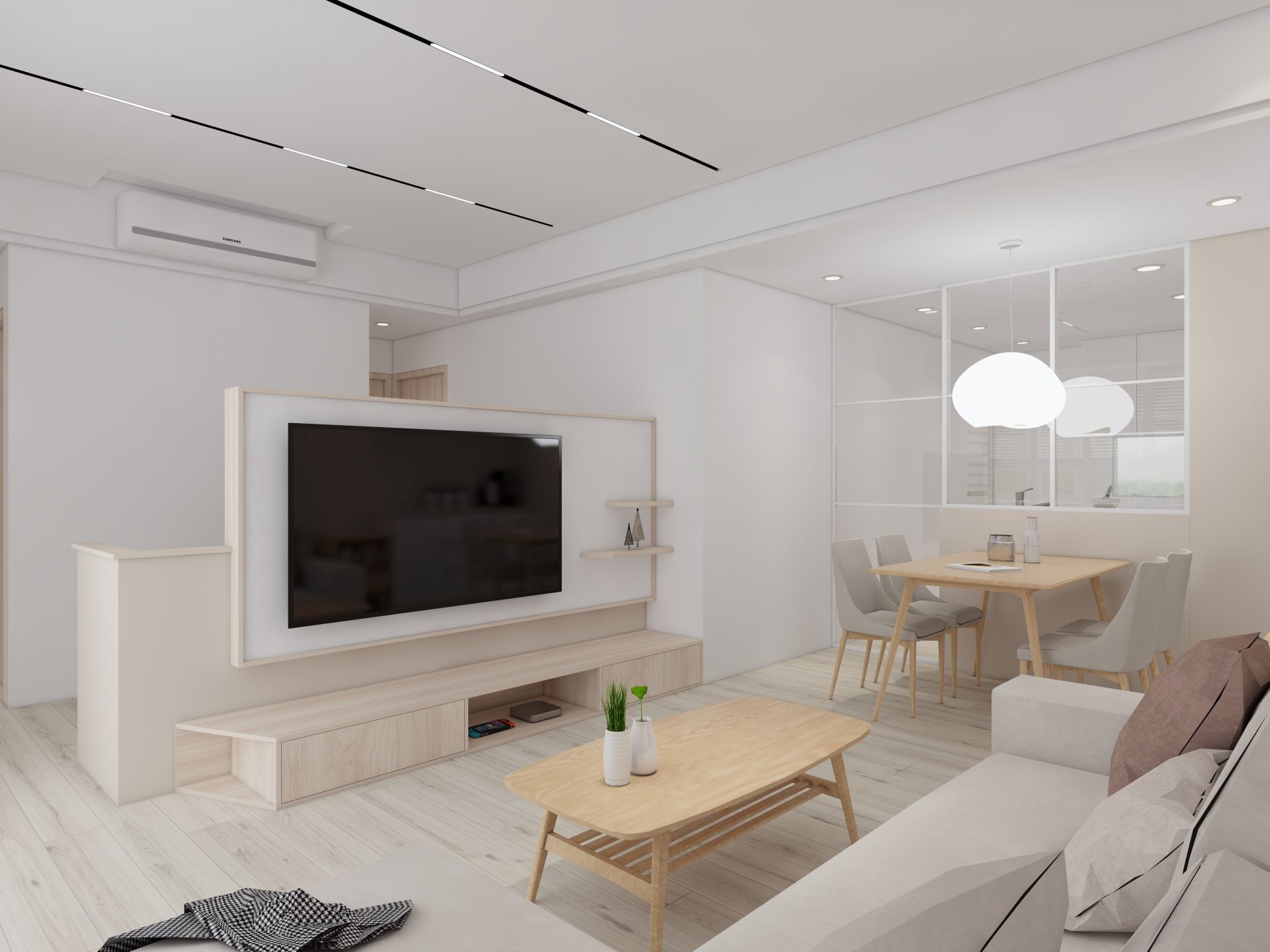 白色調電視牆作為空間的主視覺,廚房以半開放式概念設計,運用玻璃推拉門達到視覺延伸擴大空間感,不僅兼顧風水考量,還能避免煮食後油煙亂竄的窘況。