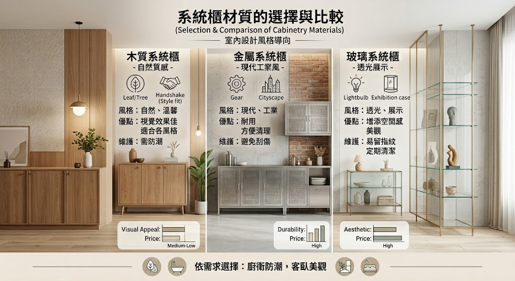 • 常見的系統櫃材質:木質、金屬、玻璃等,各具不同特點與適用場景。
